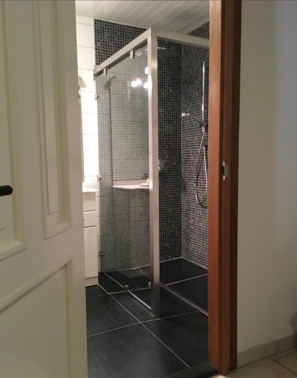 Badkamer met inloopdouche en extra regendouche, badkamermeubel en vrijhangend toilet.